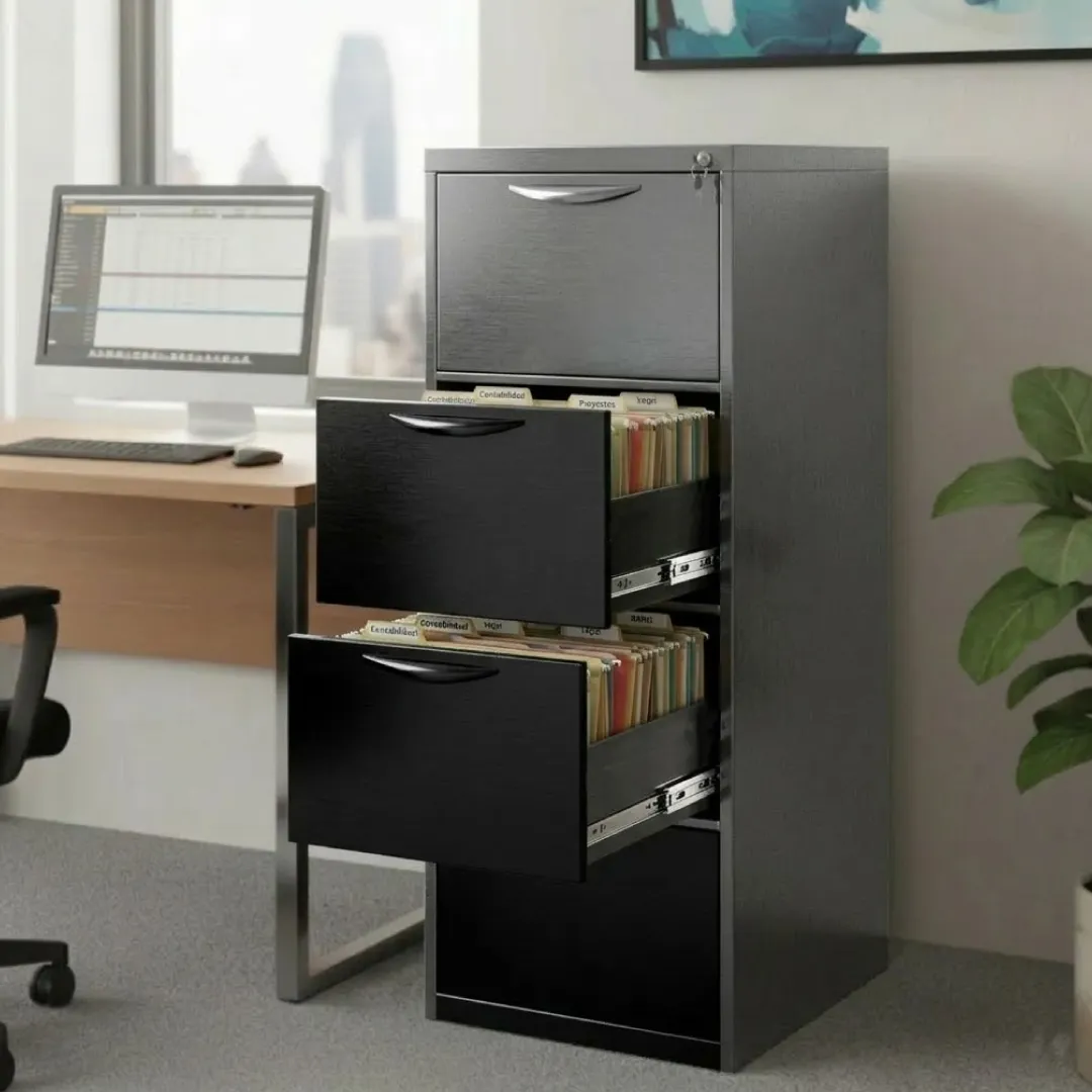 Archivador vertical fabricado en estructura metálica resistente, acabado en pintura electrostática al horno color negro mate, de 4 gavetas con rieles de full extensión para fácil acceso, cerradura para las 4 gavetas para mayor seguridad