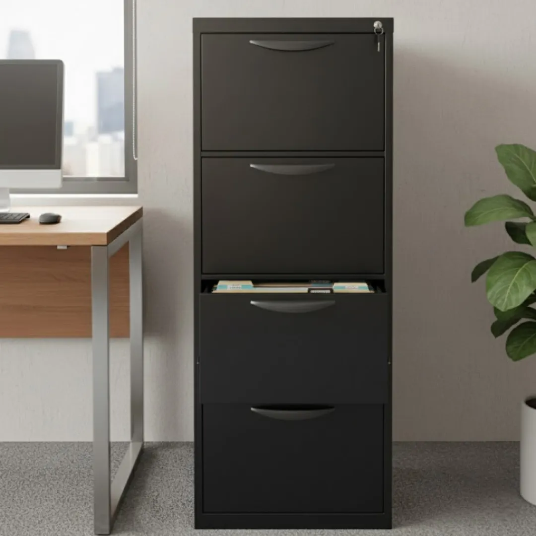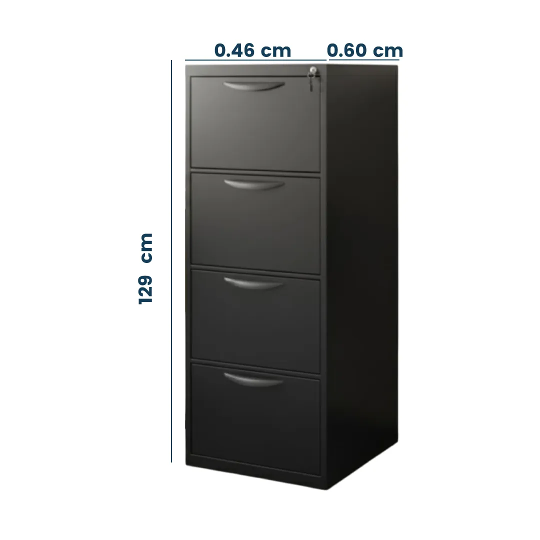 Archivador vertical fabricado en estructura metálica resistente, acabado en pintura electrostática al horno color negro mate, de 4 gavetas con rieles de full extensión para fácil acceso, cerradura para las 4 gavetas para mayor seguridad