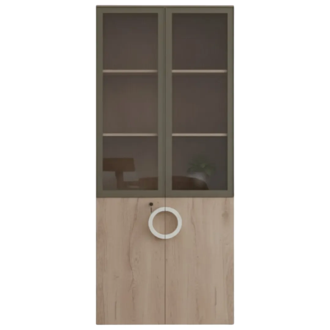 • Diseño elegante: Estructura en madera con acabado natural y puertas de vidrio con marco metálico.