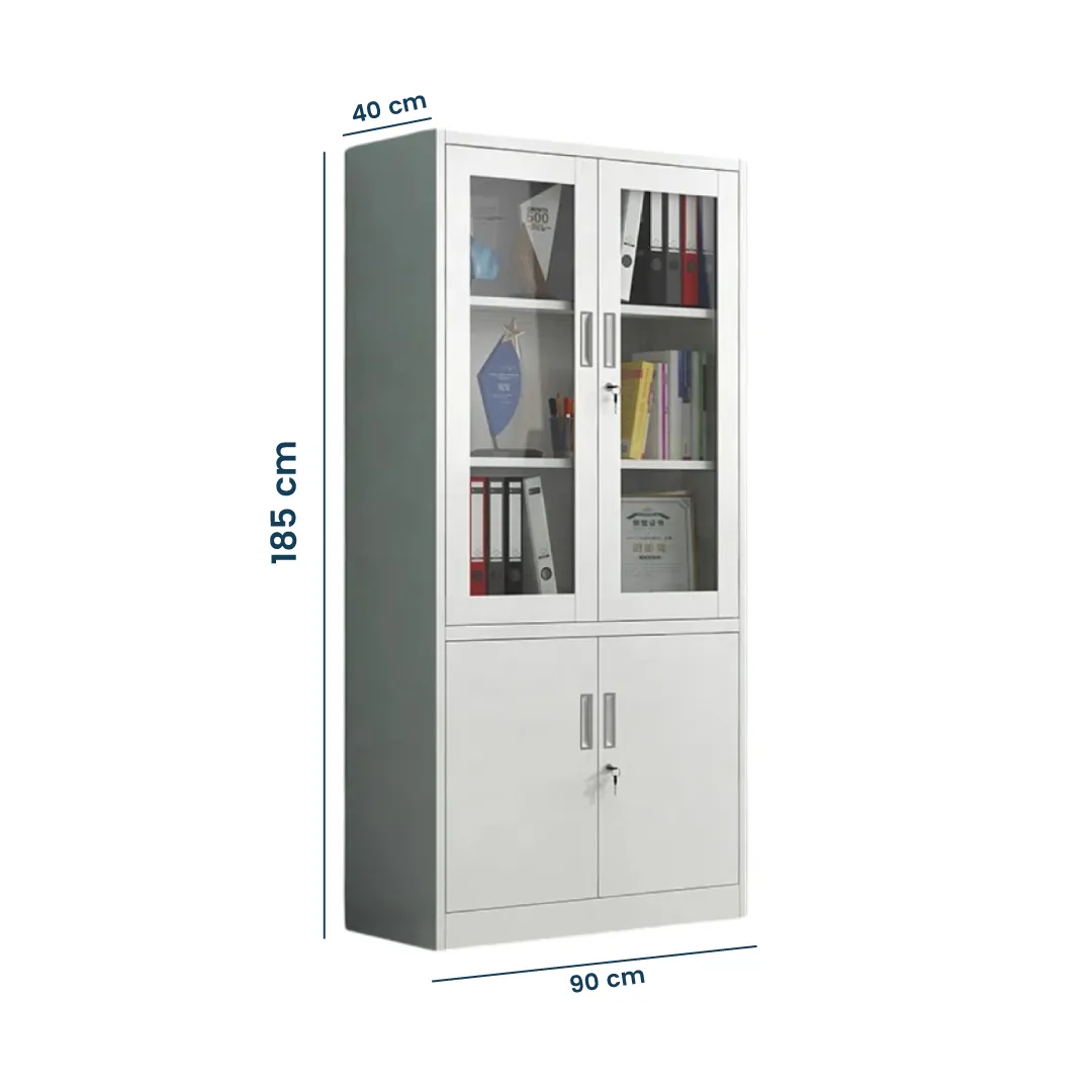 estructura metálica robusta en color blanco, puertas superiores de vidrio transparente con cerradura, parte inferior cuenta con puertas metálicas con cerradura, perfectas para guardar materiales confidenciales o menos estéticos, estantes internos son ajustables en altura, lo que te da flexibilidad para organizar desde archivadores hasta elementos decorativos.