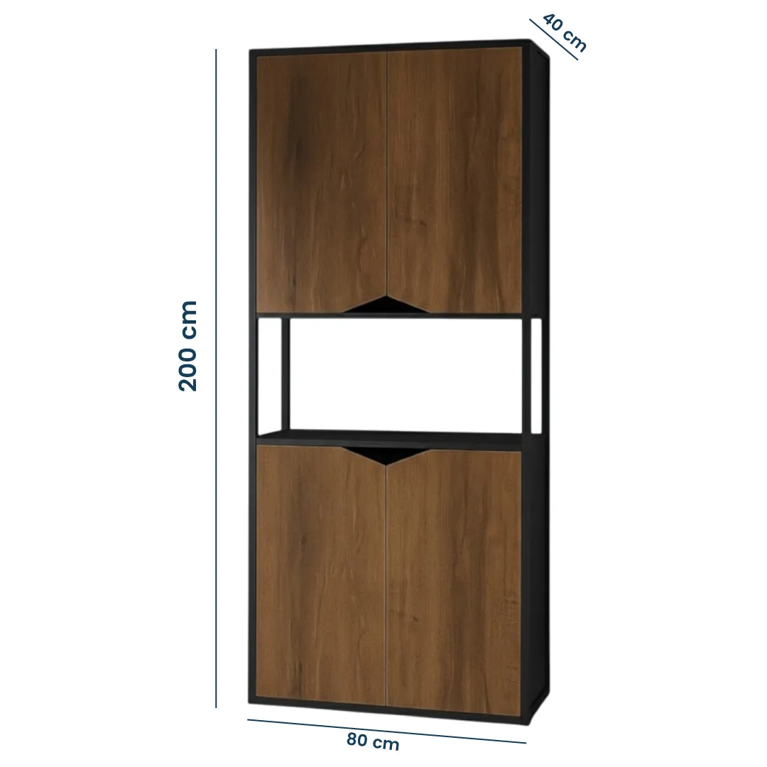 Nuestra biblioteca Stonia combina una estructura metálica color negro resistente con acabados en madera resistente de 15mm color cafe, Cuenta con dos compartimentos cerrados con puertas abatibles y cerradura en la parte superior e inferior, ideales para mantener documentos o materiales fuera de vista, y una repisa central abierta para exhibir objetos decorativos o de uso frecuente.