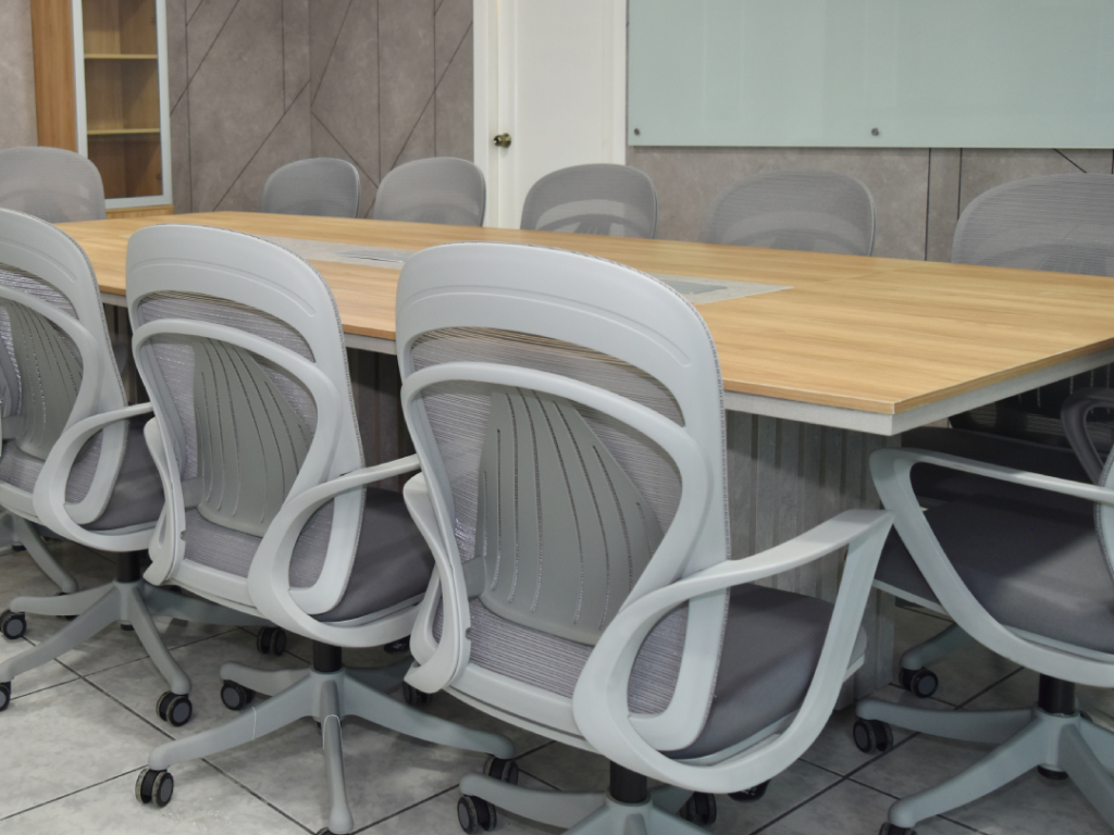 Sala de reuniones con mesas que integran usb, hdmi y tomacorrientes.