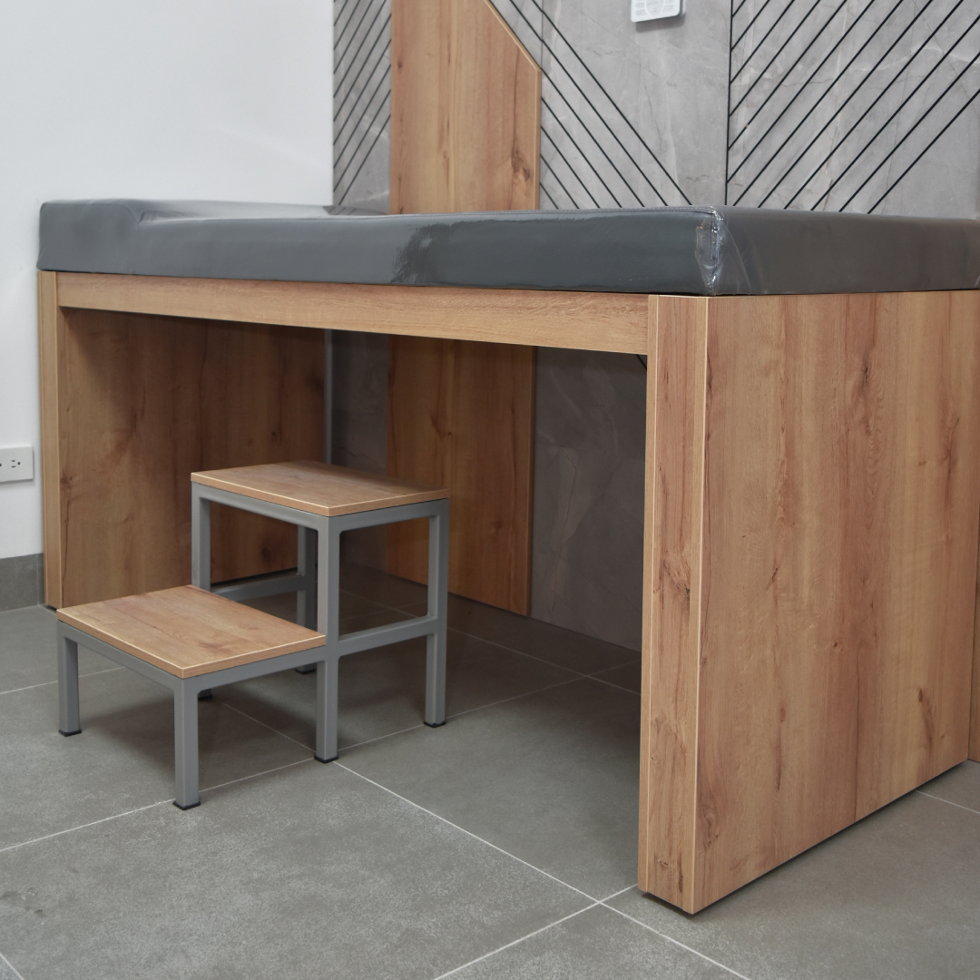 El consultorio principal transmite modernidad y confort, equipado con un chaise longue elegante que genera una experiencia de descanso y bienestar desde el primer momento. Los revestimientos en tonos neutros refuerzan la calidez, el estilo y crean una atmósfera profesional y acogedora.