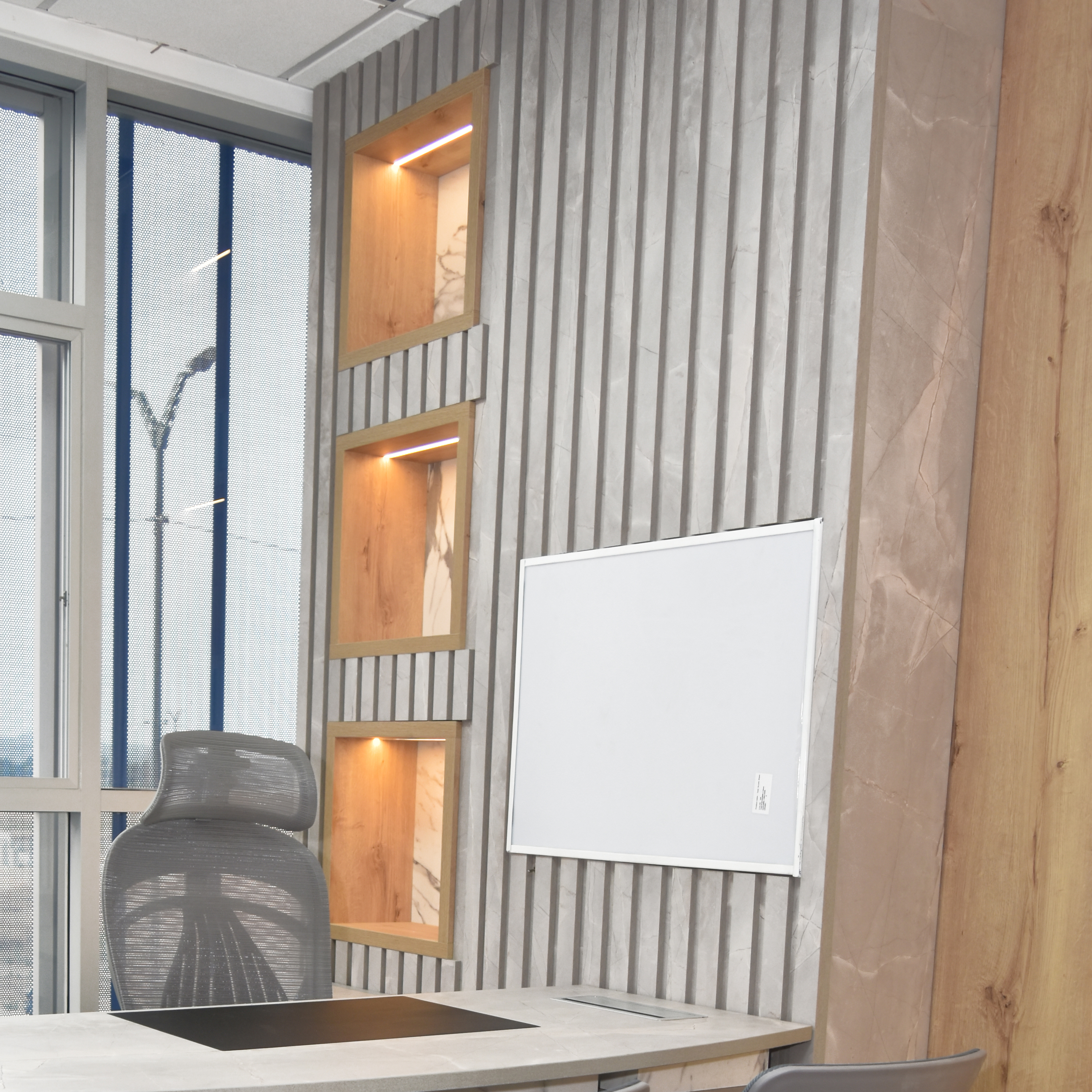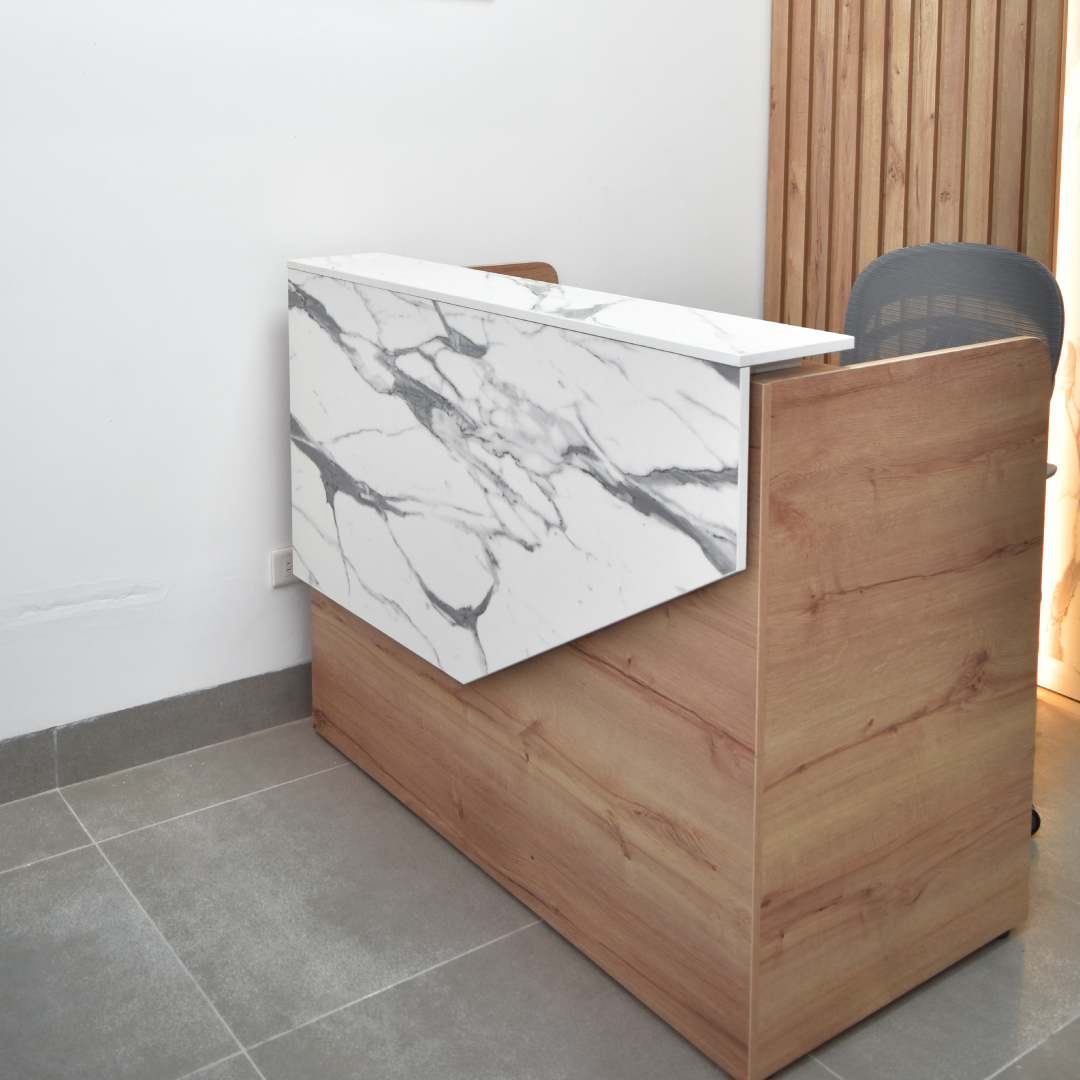En el área de gerencia, la credenza funcional y estilizada con revestimientos garantiza organización sin renunciar a la elegancia. El escritorio principal, diseñado bajo un equilibrio entre funcionalidad y estética, permite una atención fluida gracias a sus muebles ergonómicos y materiales fáciles de mantener.