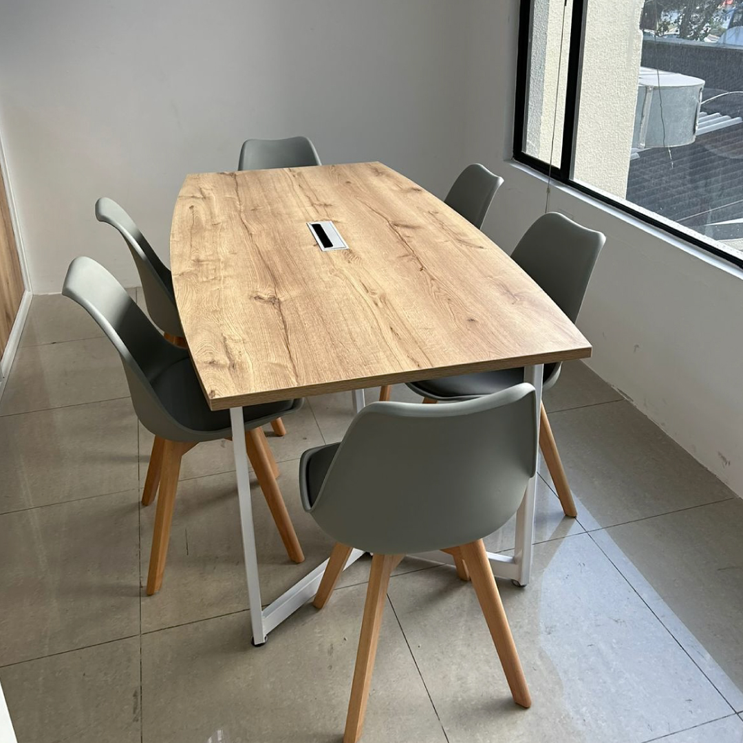 Zona de Colaboración: La mesa de juntas, con un acabado impecable en madera, se acompaña de sillonería ergonómica de vanguardia, ideal para sesiones de brainstorming y toma de decisiones importantes.