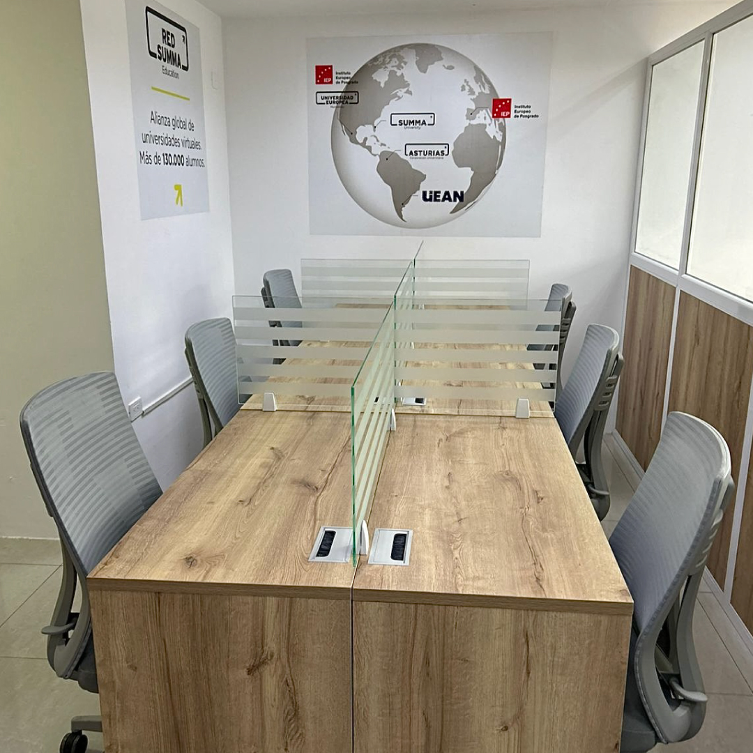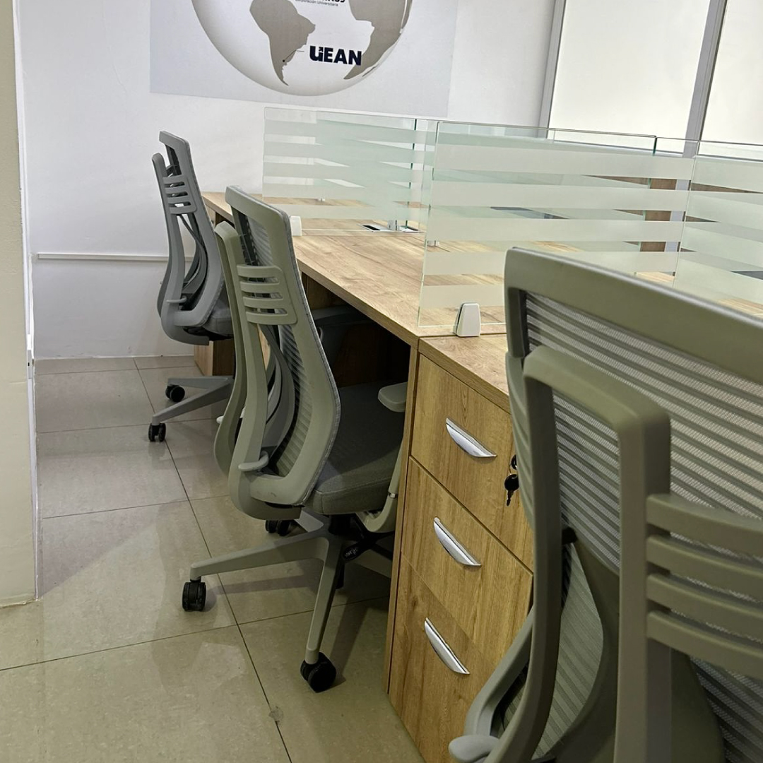 Productividad Compartida: Diseñamos estaciones de trabajo optimizadas con divisiones de vidrio esmerilado, que fomentan el orden y la concentración en espacios abiertos.