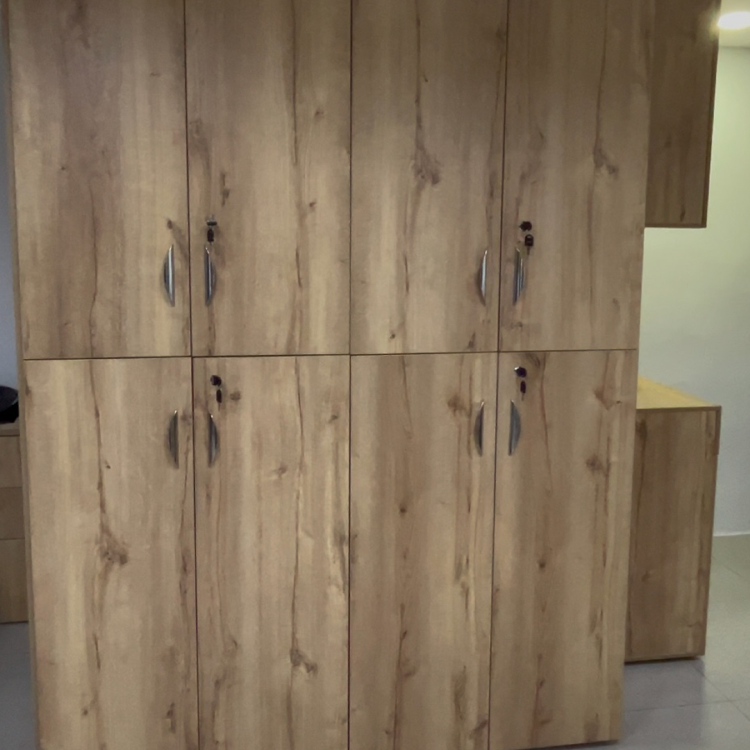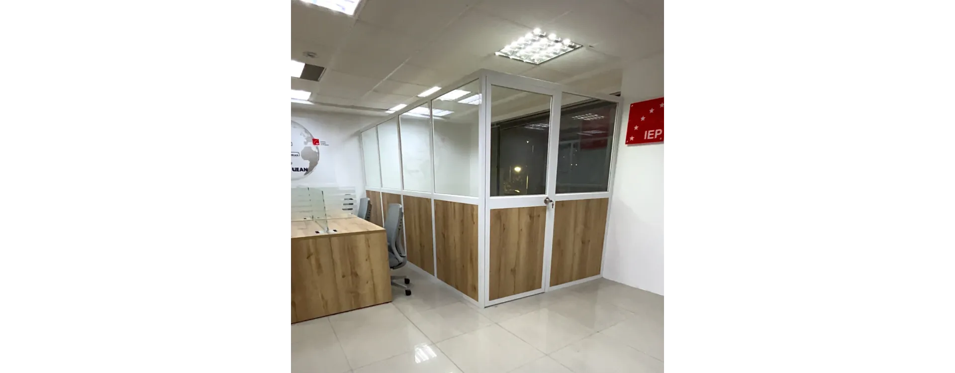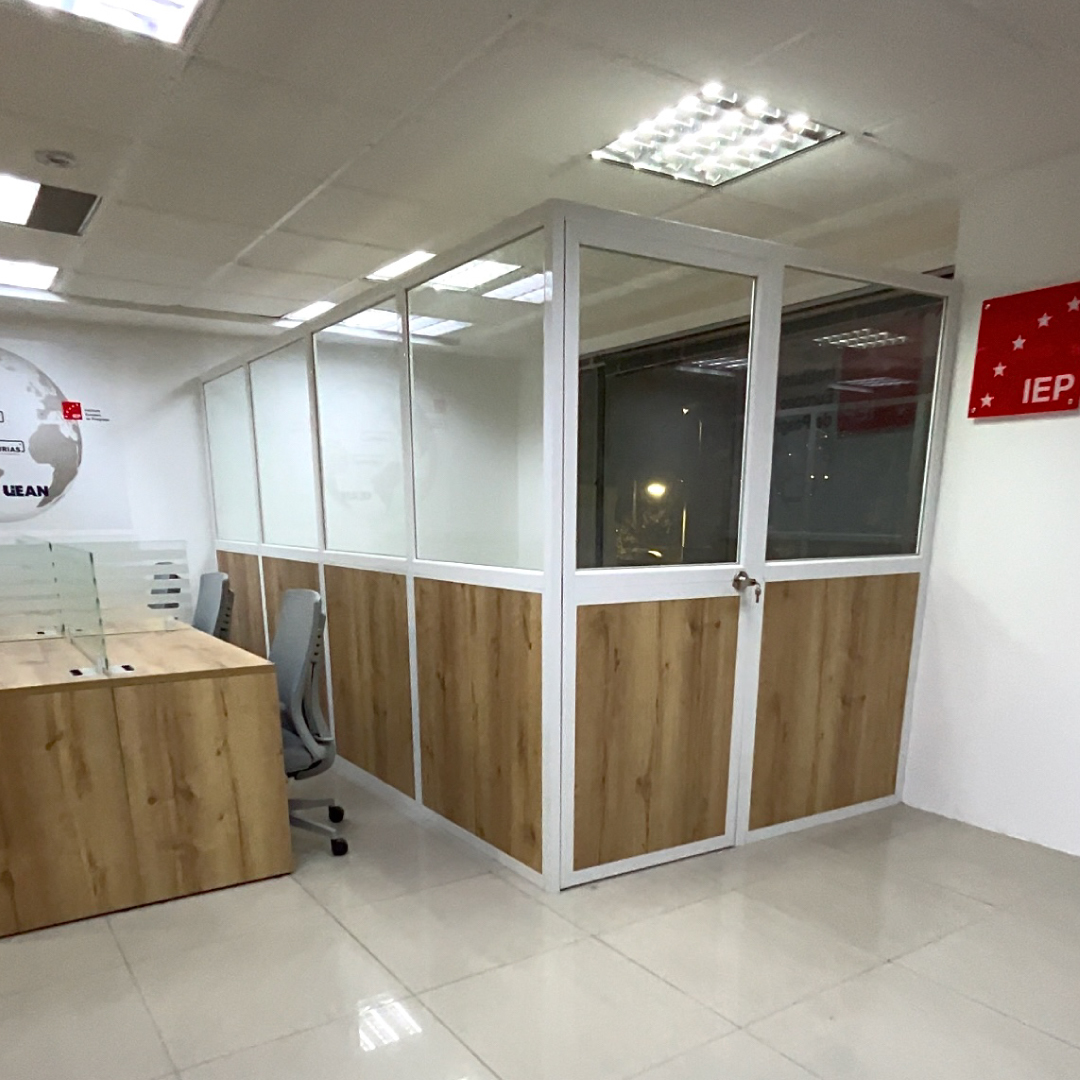 Mamparas Divisorias y Privacidad: Instalamos un sistema de mamparas en estructura de aluminio con vidrio, complementadas con paneles en madera Macadamia y una puerta abatible coordinada. Esta combinación permite el flujo de luz natural sin sacrificar la privacidad necesaria.