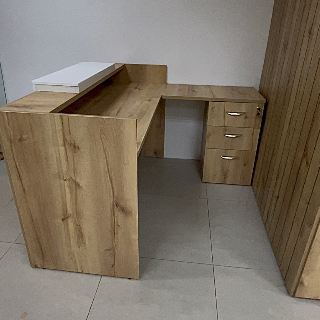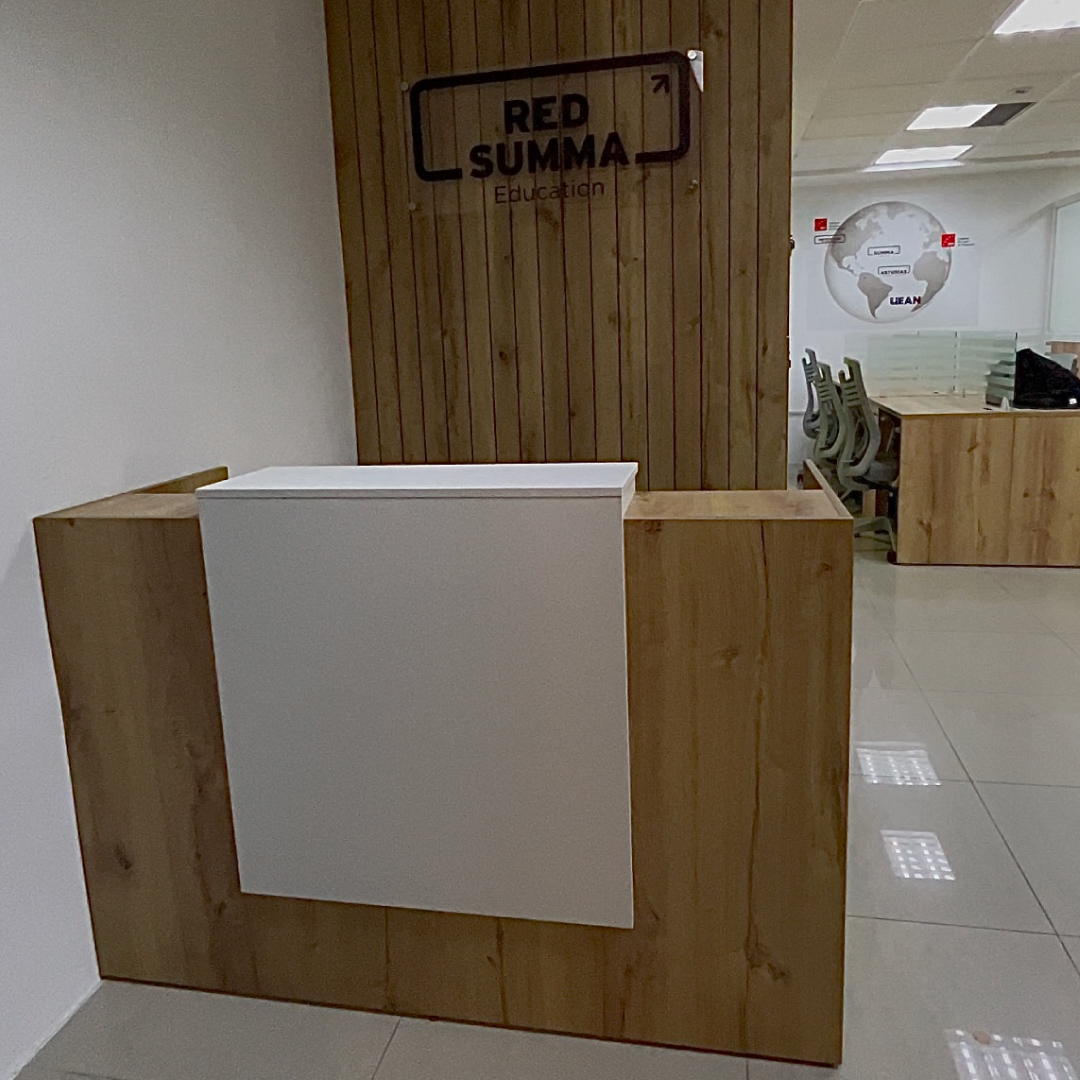 Áreas Complementarias: Desde la primera impresión con un imponente counter de recepción, hasta la funcionalidad de un mueble de cafetería a medida y un modular tipo biblioteca para almacenamiento inteligente.