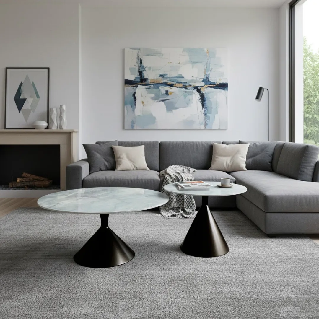 Diseño vanguardista de bases cónicas y superficie de porcelanato con vetas grises, este conjunto es la pieza central perfecta para hogares que buscan un estilo sofisticado y minimalista.