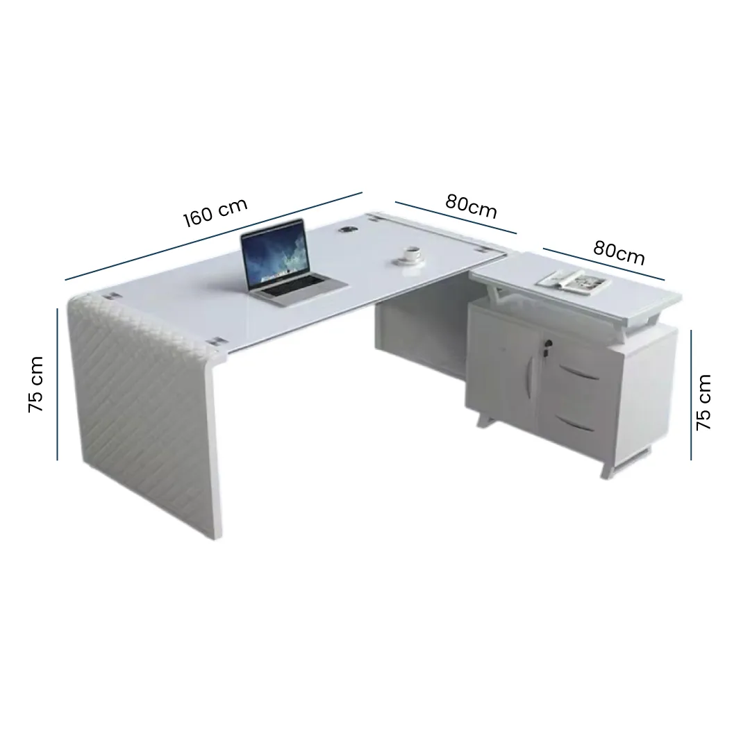 Escritorio Leticia en L superficie en vidrio templado blanco de 12mm filos con acabado biselado, estructura metálica, parte lateral y faldón con textura acolchada en cuerina sintética con diseño de costura, credenza auxiliar integrada estructurado en madera resistente de 15mm, con gavetas de almacenamiento y compartimentos con cerradura, perfecta para mantener organizados documentos y objetos personales.