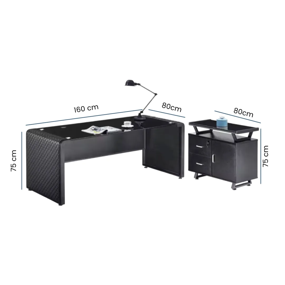 Escritorio Leticia en L superficie en vidrio templado negro de 12mm filos con acabado biselado, estructura metálica, parte lateral y faldón con textura acolchada en cuerina sintética con diseño de costura, credenza auxiliar integrada estructurado en madera resistente de 15mm, con gavetas de almacenamiento y compartimentos con cerradura, perfecta para mantener organizados documentos y objetos personales.