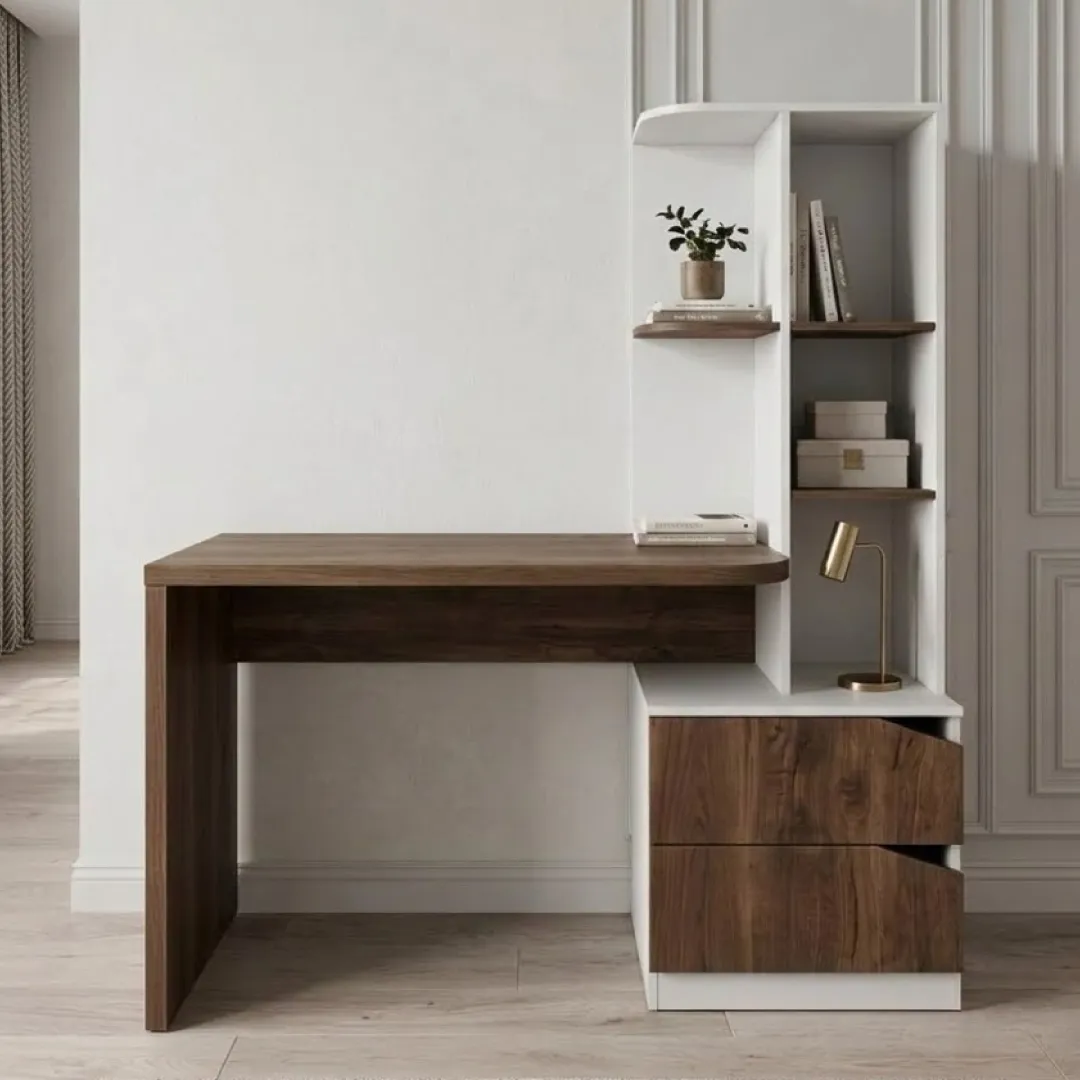 Eleva tu espacio de trabajo con este escritorio que combina a la perfección la calidez de la madera con un diseño funcional de vanguardia. Ideal para home office, estudios o habitaciones juveniles, este mueble no es solo una mesa, sino una estación de trabajo completa diseñada para maximizar el orden y la productividad.