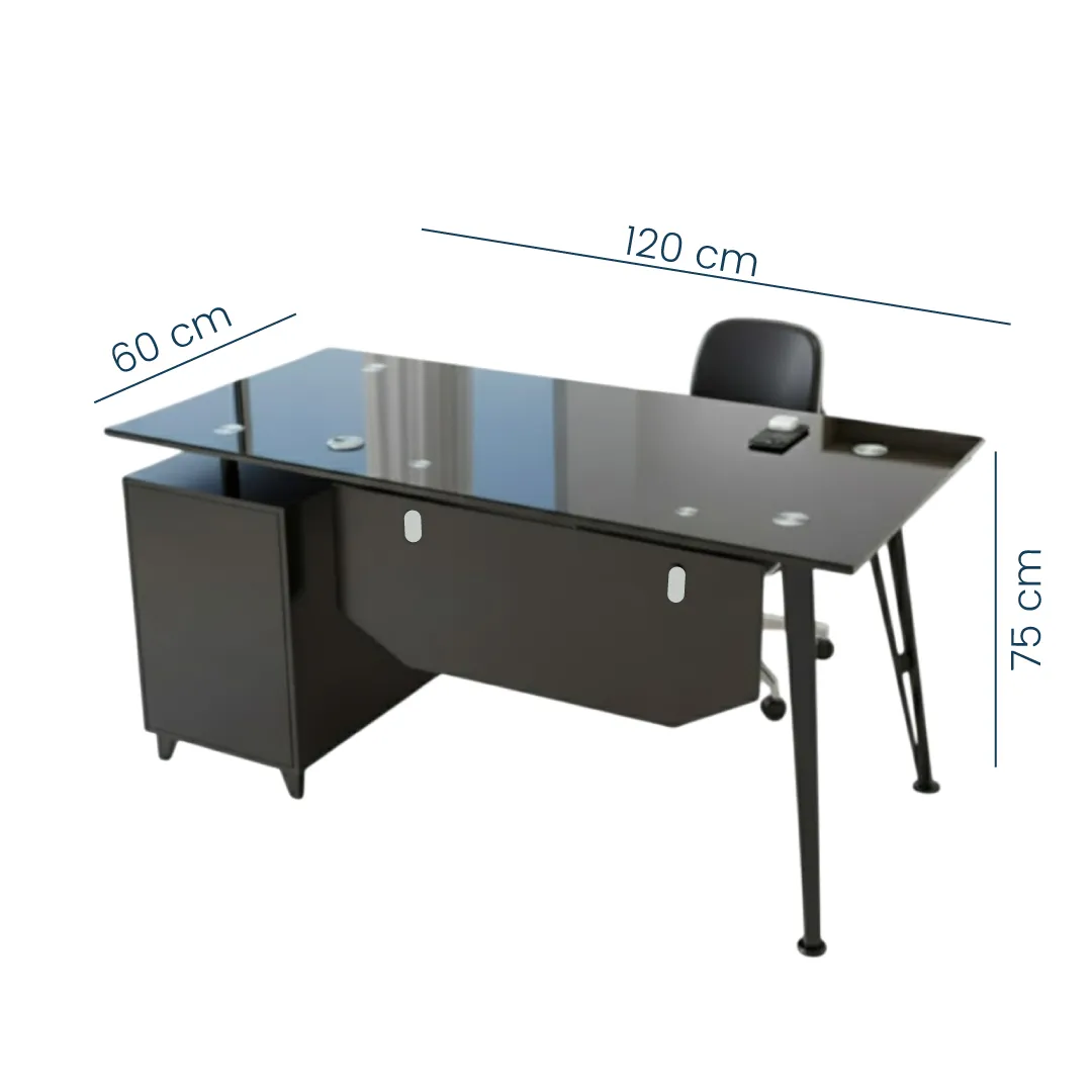 Escritorio operativo con superficie en vidrio templado de 12mm filos con acabado biselado, pata metálica con diseño especial, cajonera estructurado en madera de 15mm con 3 gavetas, 1 grande y 2 pequeñas para suministros, con cerradura que asegura las tres gavetas, más faldón cubre piernas en vidrio templado