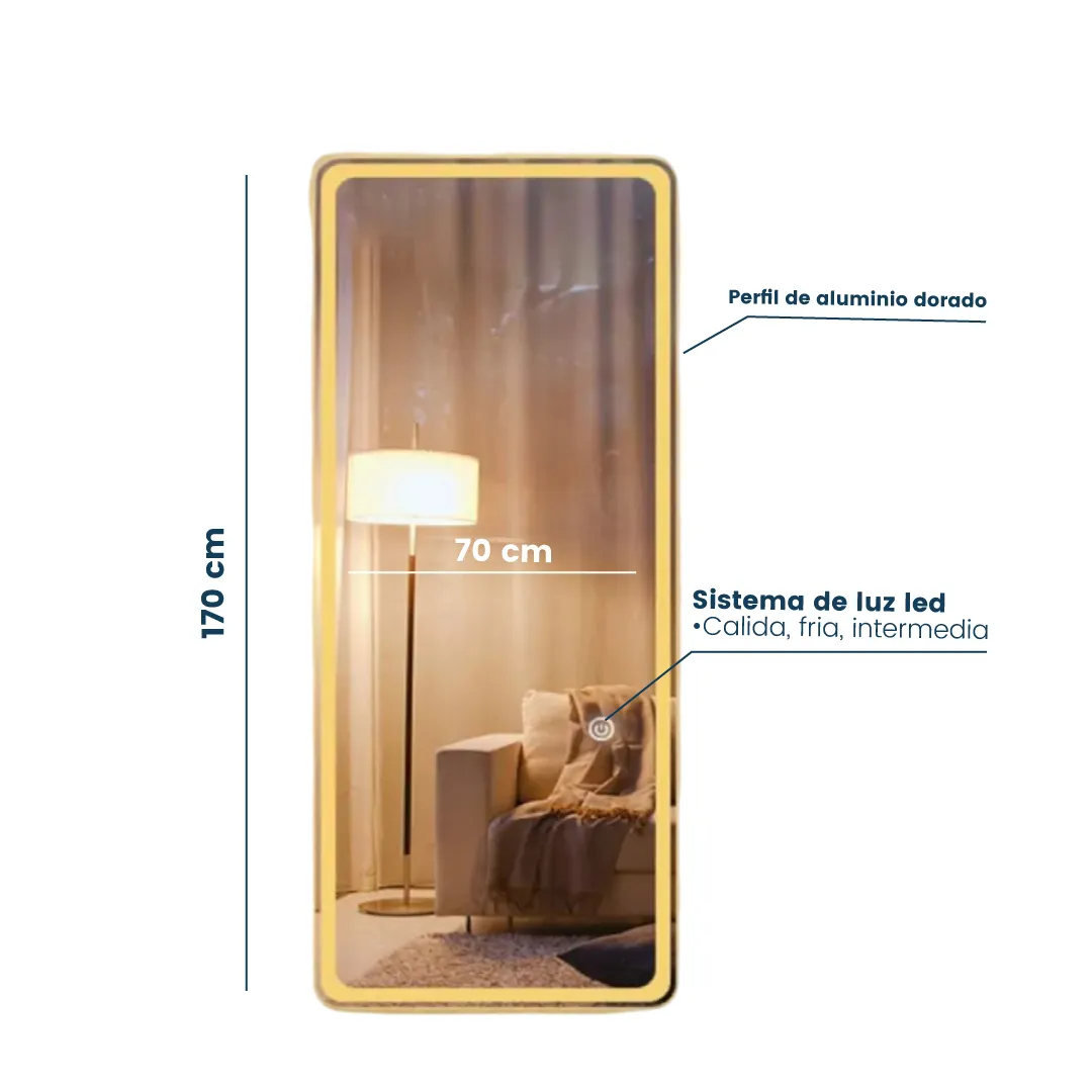 Diseño rectangular vertical con Iluminación LED de tres tiempos integrada con Sistema Touch, de enciende y apaga fácilmente la luz con solo un toque, Marco minimalista de aluminio acabado limpio y elegante color dorado, fácil de instalar