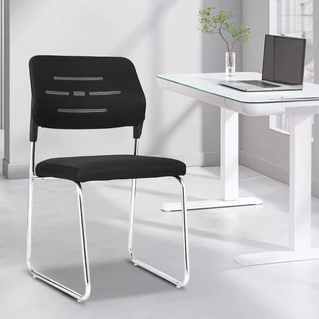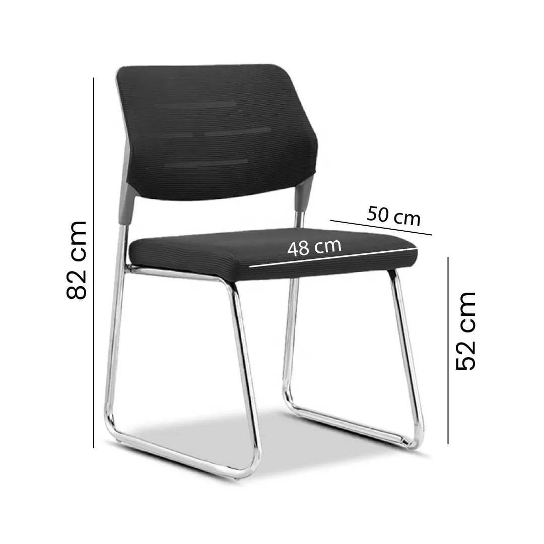 Silla fija Selena, cuenta con asiento y respaldo acolchados, tapizado en tela malla transpirable que brindan comodidad al usuario, y un respaldo con diseño ergonómico que favorece una postura adecuada, estructura metálica cromada tipo trineo que aporta estabilidad.