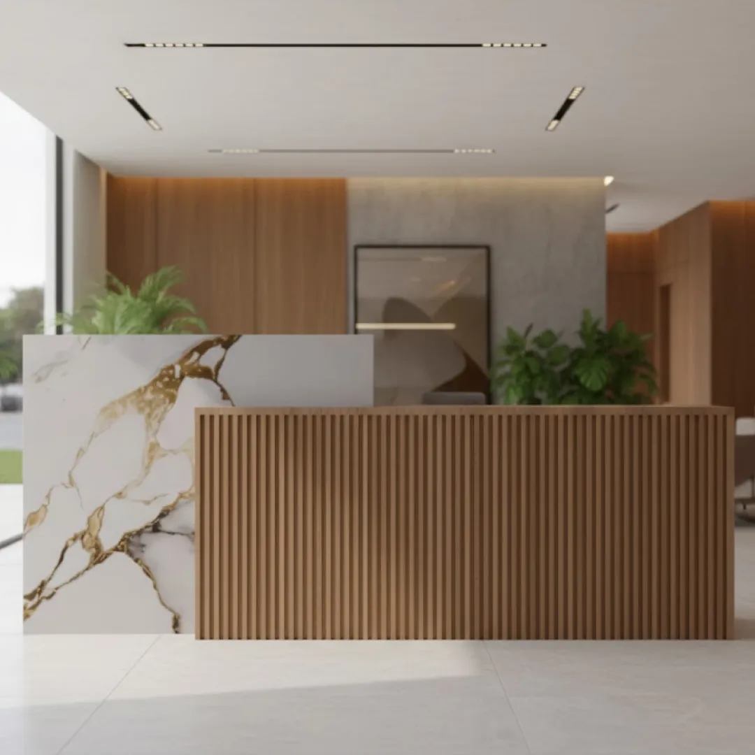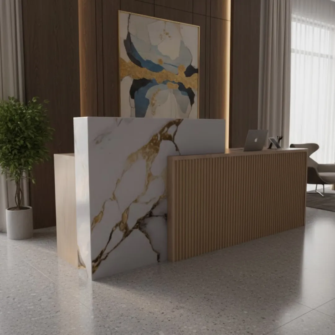 Nuestro exclusivo counter de recepción combina elegancia contemporánea, materiales premium y una distribución diseñada para optimizar el trabajo diario en espacios corporativos, oficinas, hoteles y centros de atención. Su diseño integra superficies en acabado marmoleado con vetas doradas y paneles frontales en WPC, creando una pieza visualmente impactante y altamente duradera.