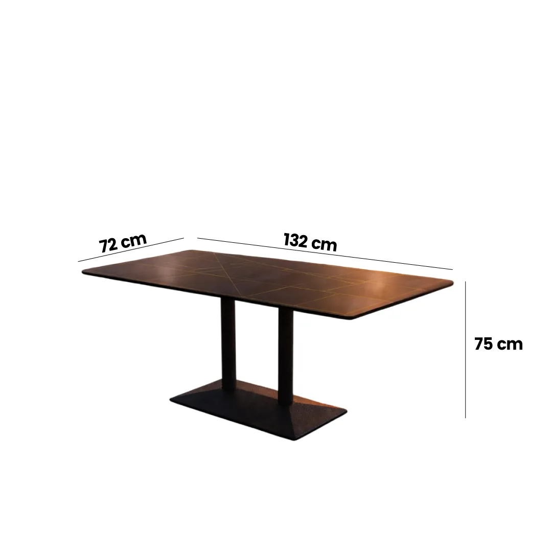 superficie rectangular de porcelanato de 12mm color negro veteado de alta calidad con acabado biselado y puntas redondeadas, fácil de limpiar, resistente al calor y a la humedad, Base doble color negro con pintura electroestática al horno que garantiza mayor resistencia a la corrosión