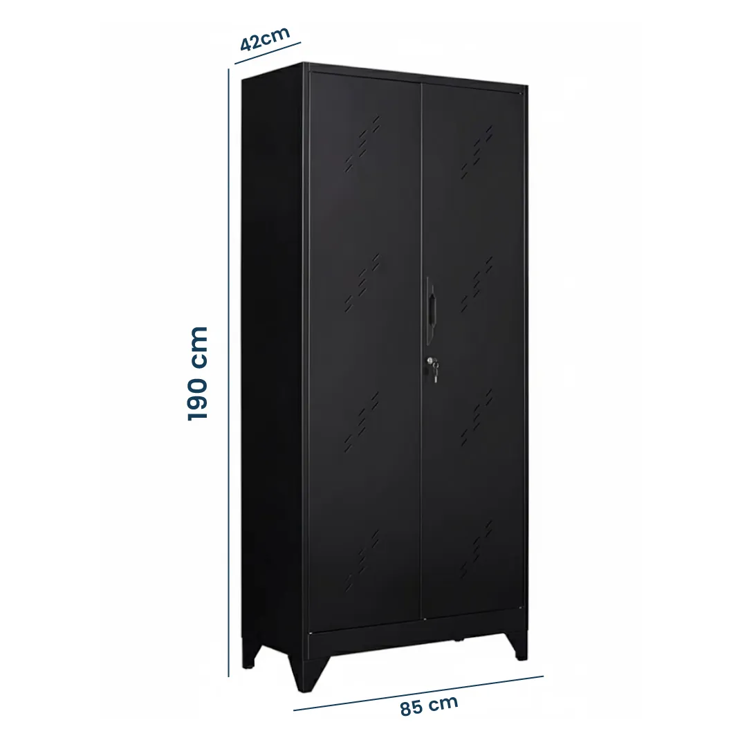 Fabricado en metal de alta durabilidad, con acabado en pintura electrostática negro, diseño funcional con puertas abatibles, bandejas internas y espacio vertical para objetos largos, sistema de ventilación perforada que evitar la acumulación de humedad.