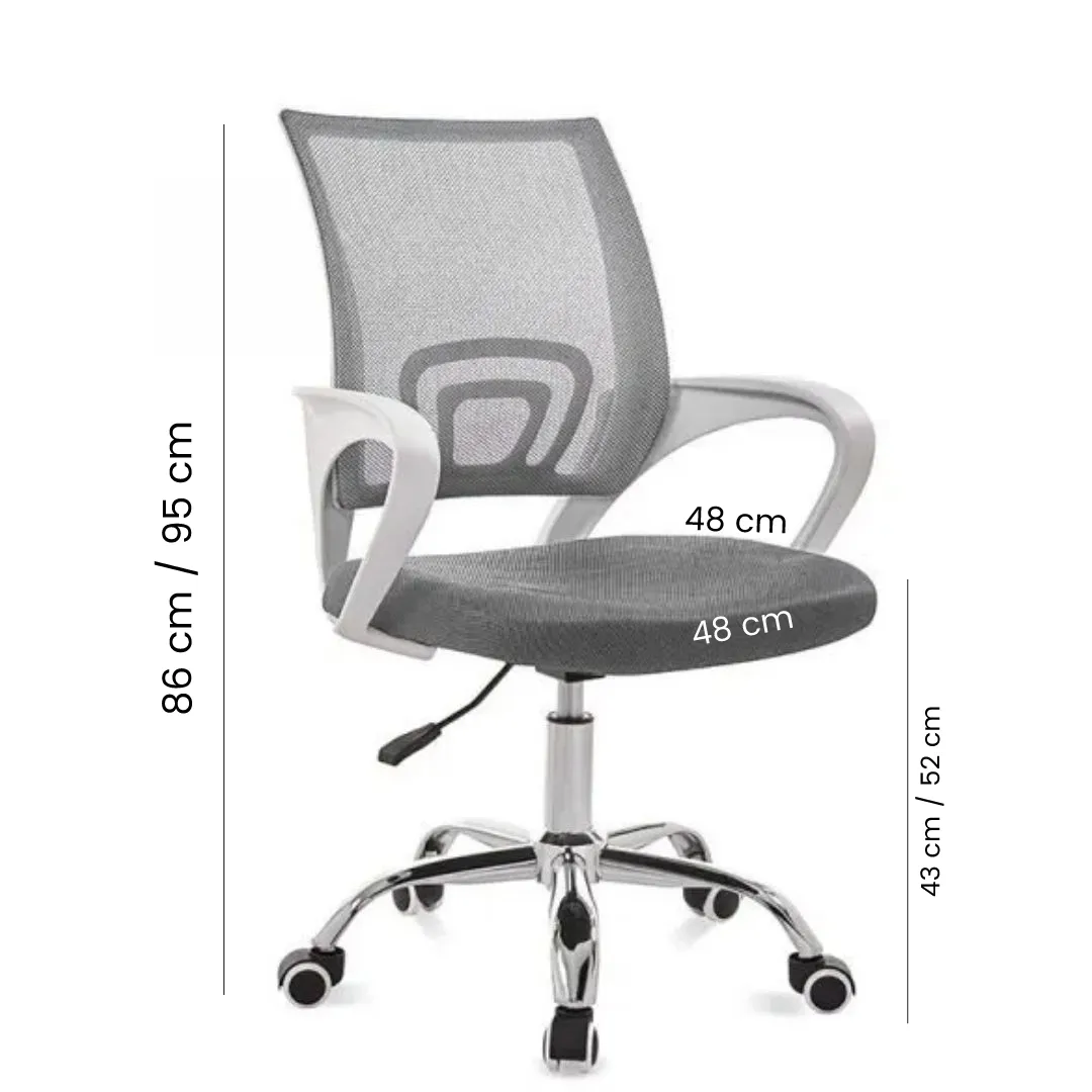 Silla Alba con respaldo en malla transpirable que favorece la ventilación, asiento acolchado, apoyabrazos fijos de diseño ergonómico que ayudan a mantener una postura correcta, mecanismo de ajuste de altura mediante palanca lateral para adaptarse a diferentes escritorios, base metálica cromada con ruedas nylon