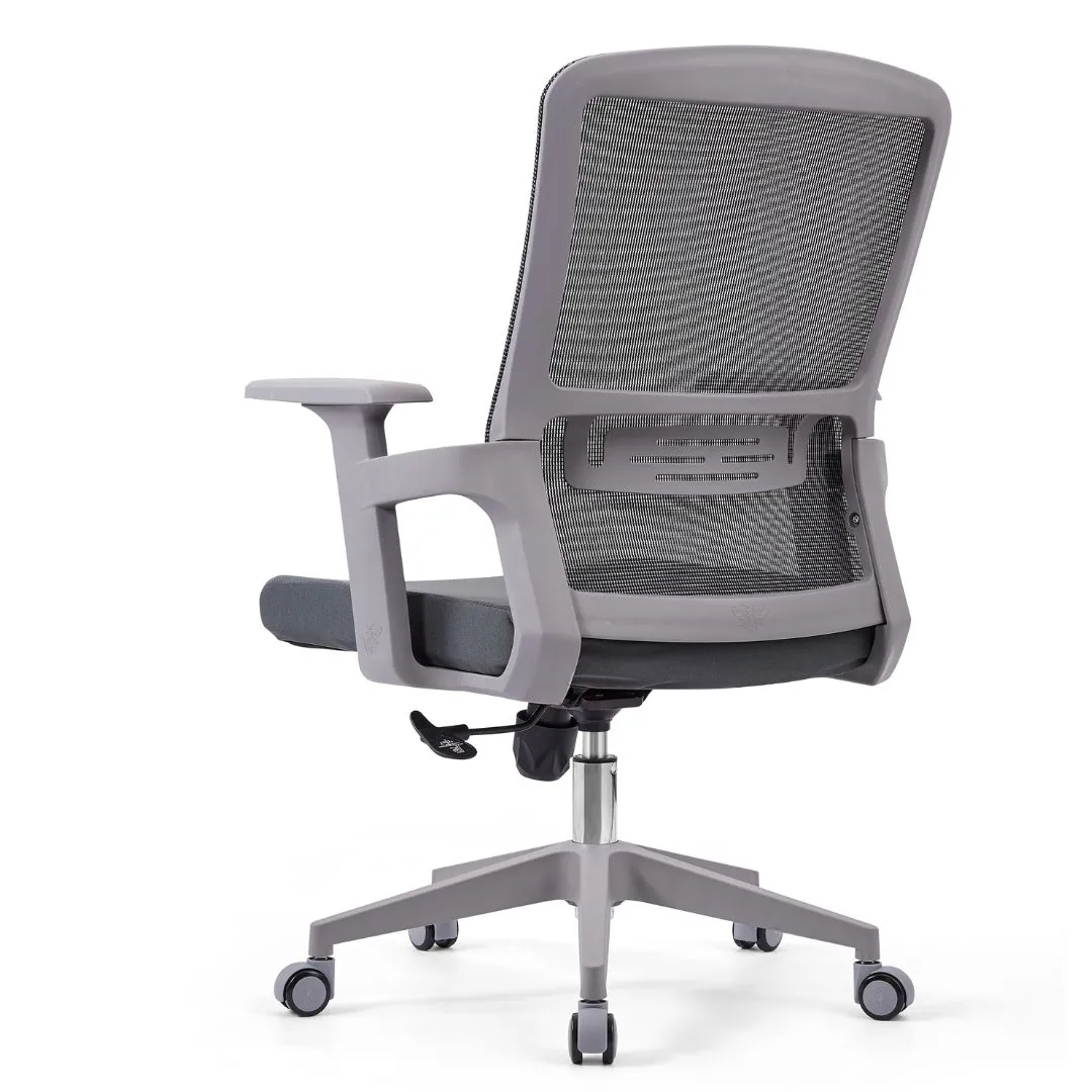 Silla Dahian con asiento acolchado de alta densidad que brinda soporte y confort, respaldo en malla transpirable, apoyabrazos fijos de material de polipropileno, mecanismo de regulación de altura mediante palanca, base nylon con ruedas giratorias que proporciona movilidad y estabilidad.