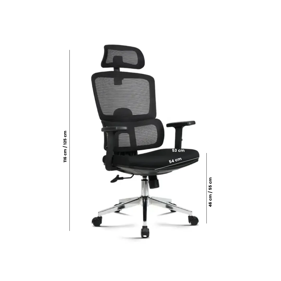 sillón ergonómico con cabecera ajustable para un máximo confort. material de tela malla transpirable de alta resistencia que permite el flujo de aire. Asiento acolchado con espuma de alta densidad tapizado en tela tipo mesh, reposabrazos ajustables que permiten adaptarse a diferentes posiciones de trabajo, Reclinación sincronizada con bloqueo multiposición y perilla de tensión ajustable, altura regulable mediante pistón neumático de elevación a gas, Base metálica cromada de 5 puntas equipada con ruedas nylon de giro suave para una movilidad eficiente.