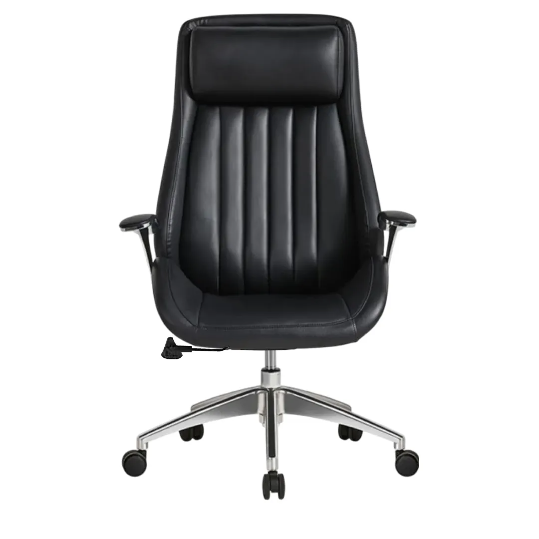 Sillón tapizado en cuero sintético color negro con costuras verticales que aporta un estilo moderno y profesional, Respaldo alto con cojín integrado para soporte cervical, espuma de alta densidad en asiento y respaldo, brazos fijos acolchados con acabado en polipropileno y detalles metálicos, mecanismo de reclinación y ajuste de altura mediante palanca, Base metálica cromada de 5 puntas con ruedas de nylon para movilidad fluida