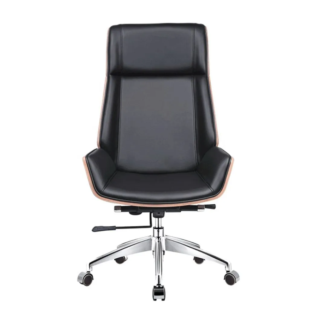 Sillón con respaldo alto ergonómico estructurado en madera, que aportan un estilo único y distinguido, tapizado en cuero sintético de fácil limpieza, asiento y respaldar acolchado con espuma de alta densidad, mecanismo regulable en altura, que permite ajustar la silla a la posición ideal de trabajo, sistema de reclinación momentánea, base metálica en aluminio con ruedas resistentes que garantizan estabilidad y movilidad fluida.
