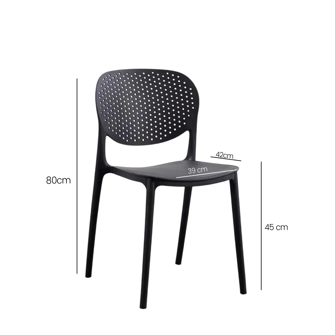 Es la solución perfecta tanto para comedores modernos como para oficinas, terrazas techadas o áreas de espera. Su estructura monocromática en negro se adapta fácilmente a cualquier paleta de colores, ofreciendo durabilidad y facilidad de limpieza en un solo producto.