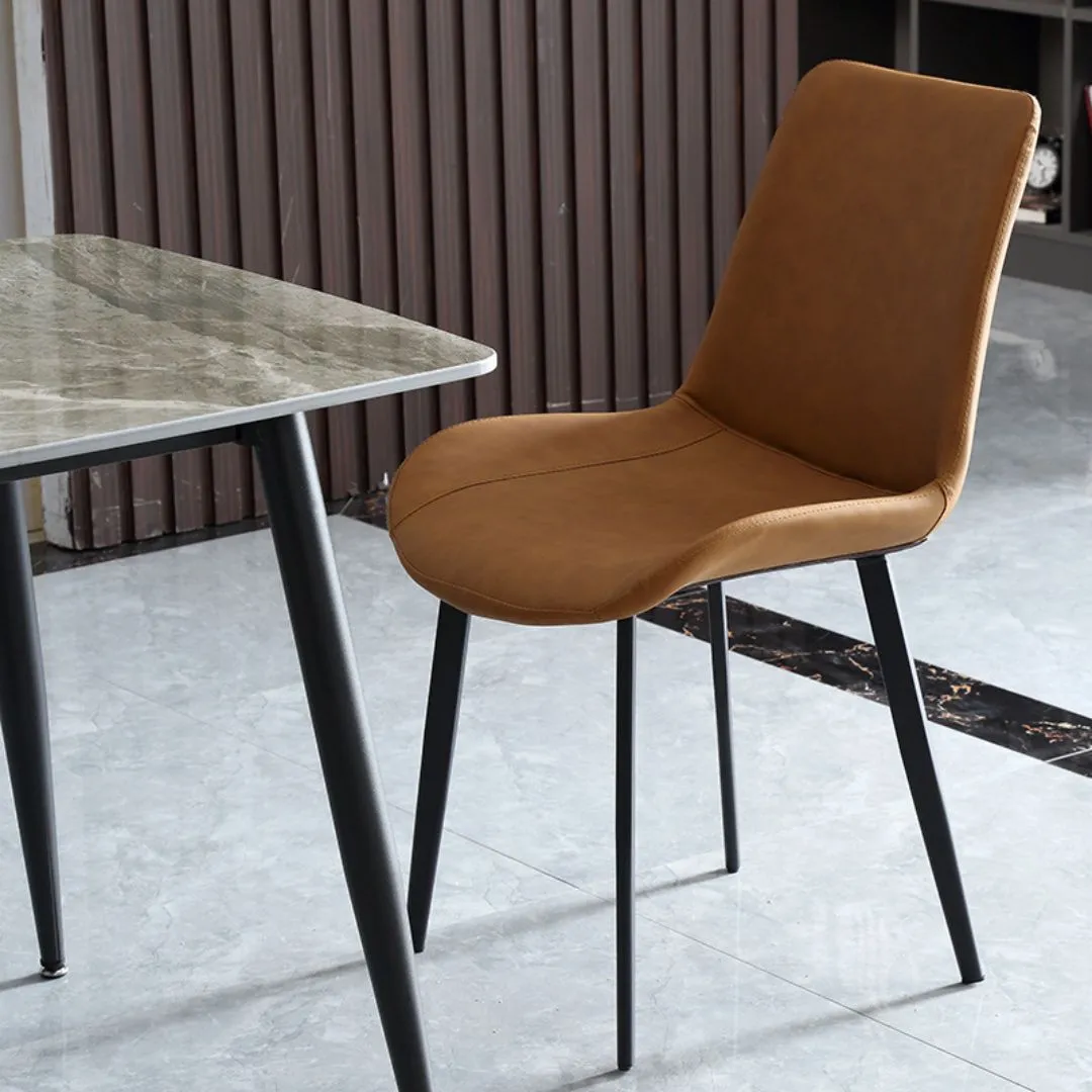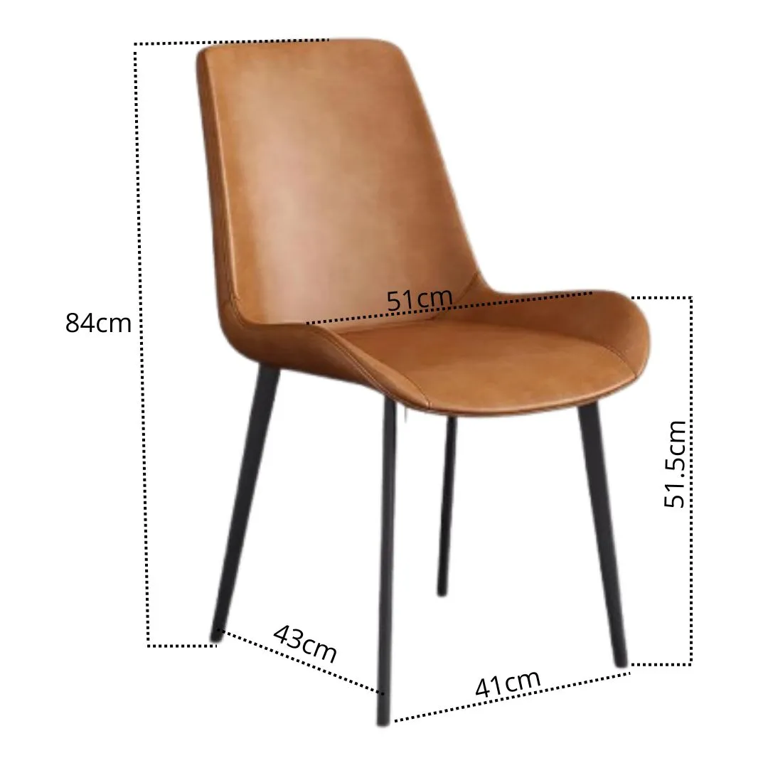 asiento y respaldo ergonómico tapizado en cuero sintético color café, fácil de limpiar y muy cómodo, estructura de metal negro de cuatro patas resistentes y estables, con resbalones en el piso para evitar rayones