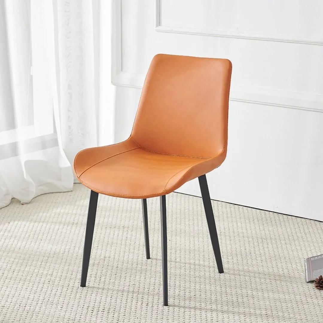 asiento y respaldo ergonómico tapizado en cuero sintético color naranja, fácil de limpiar y muy cómodo, estructura de metal negro de cuatro patas resistentes y estables, con resbalones en el piso para evitar rayones