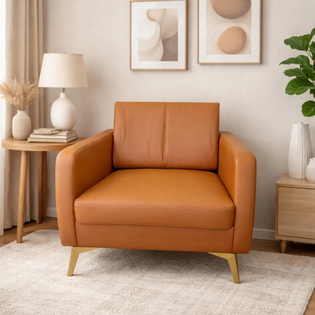 Este distinguido sofá individual combina lujo y comodidad en un diseño sofisticado. Su tapicería en cuero sintético de tonalidad cálida resalta su elegancia atemporal, mientras que su acolchado de alta densidad proporciona un confort excepcional. Sus patas metálicas con acabado dorado aportan un toque de refinamiento, ideal para espacios de estilo moderno y exclusividad.